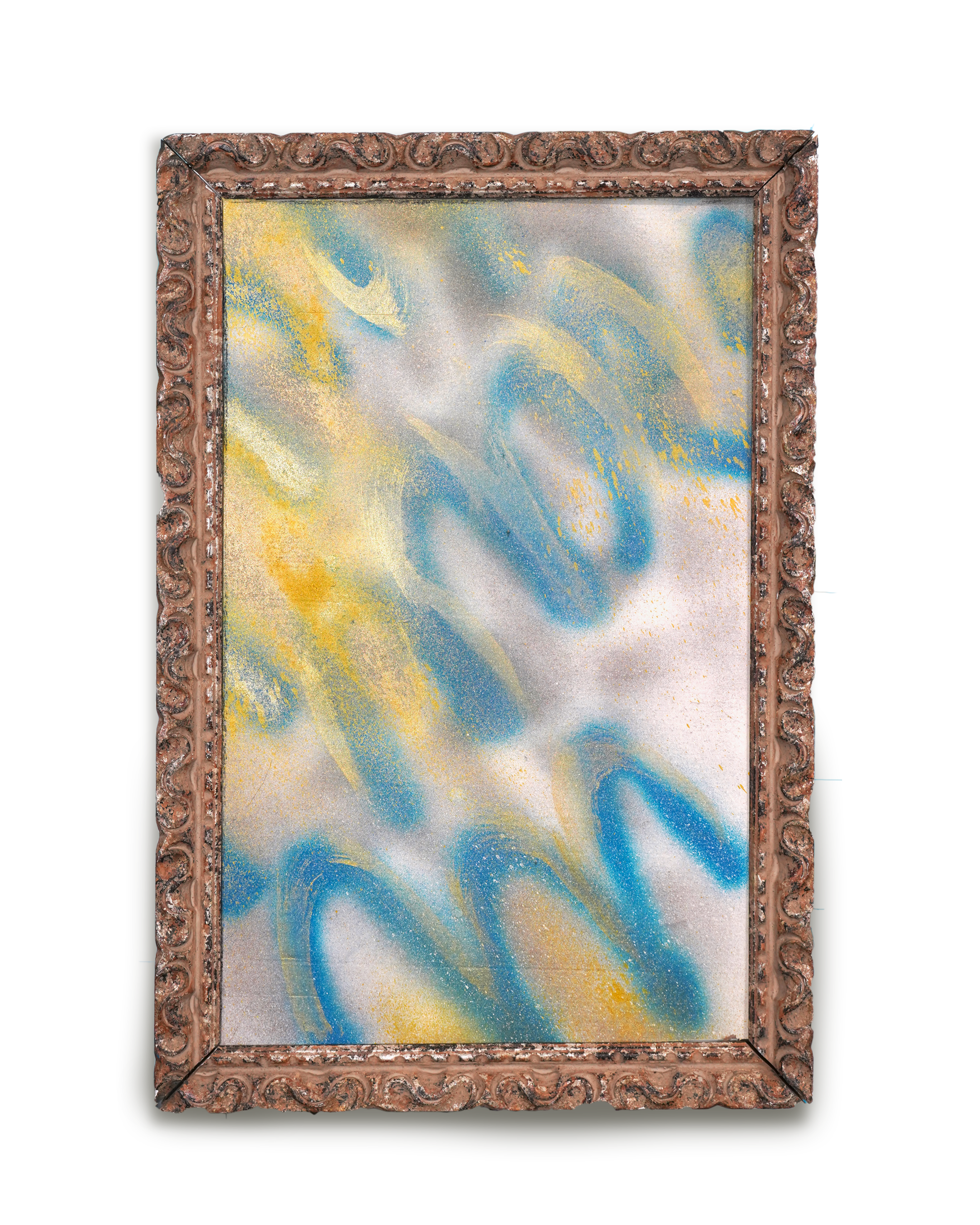 “Poster for Eros Illuminated,” spray paint and acrylic paint on cardboard, approx. 25 x 32 inches, with vintage frame. 2026.