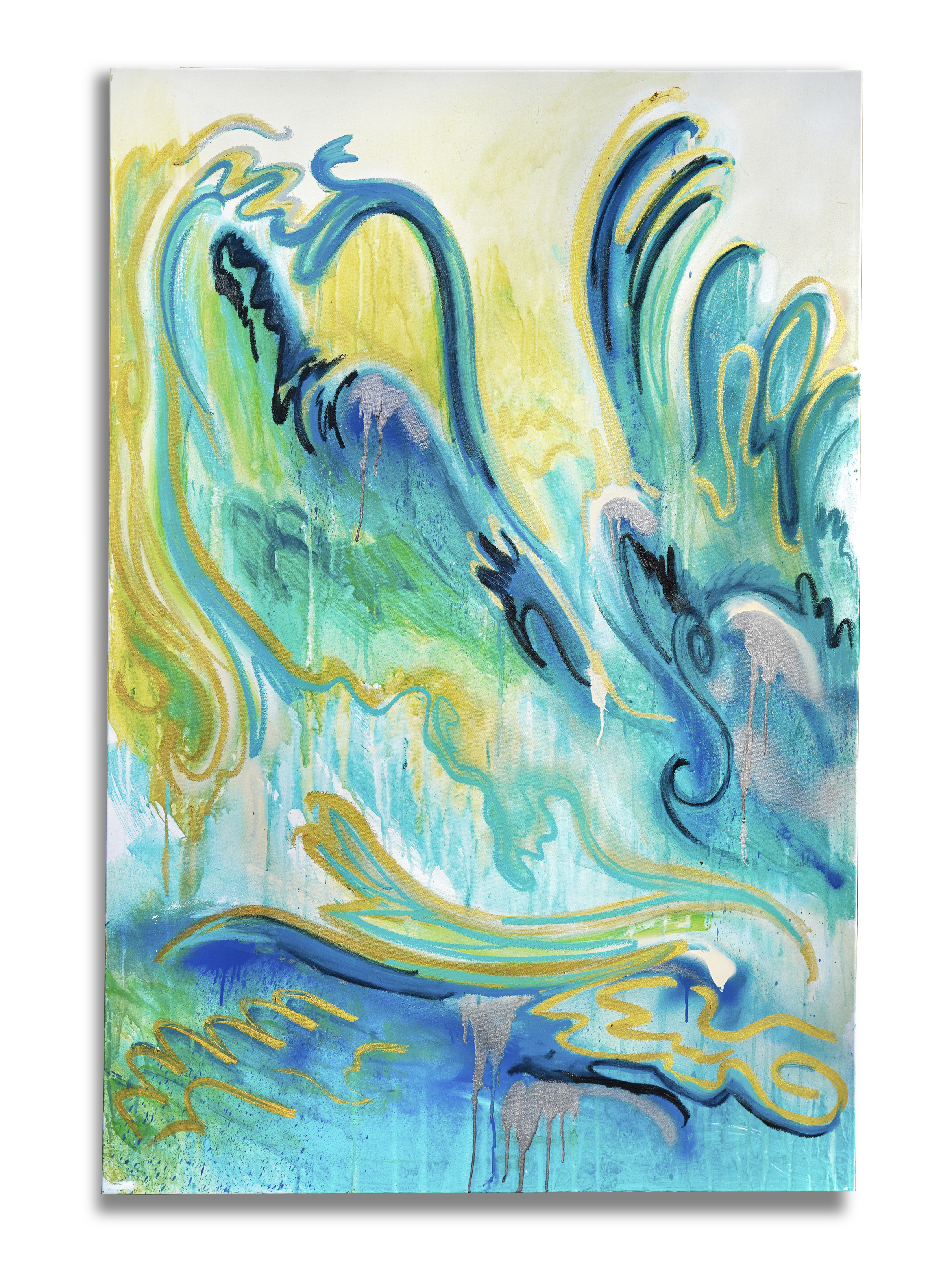 “Ocean,” acrylic paint, acrylic spray paint, oil stick on canvas, 60 x 36 inches. 2025